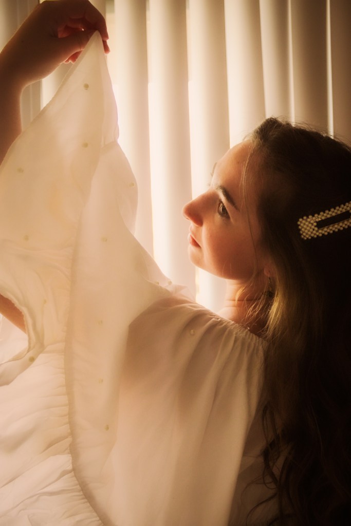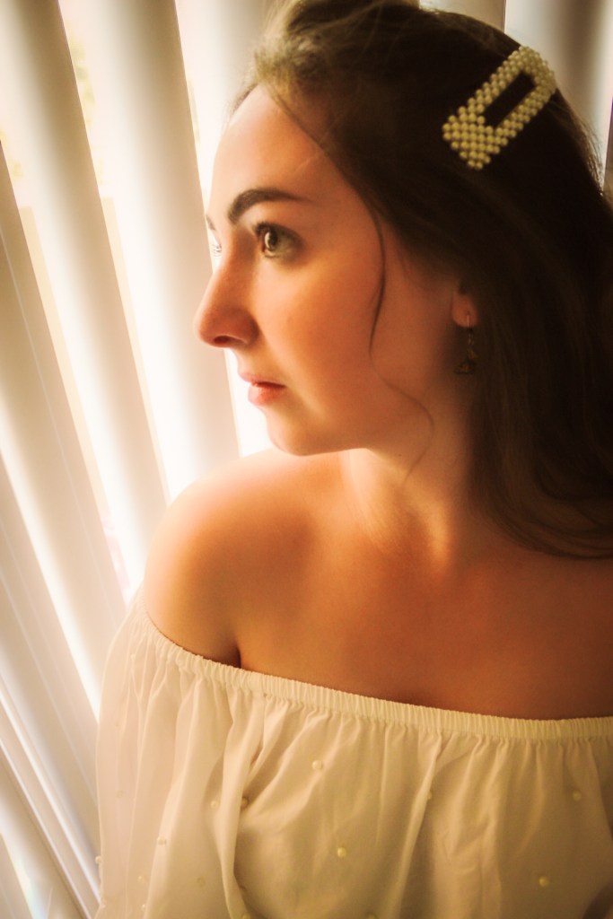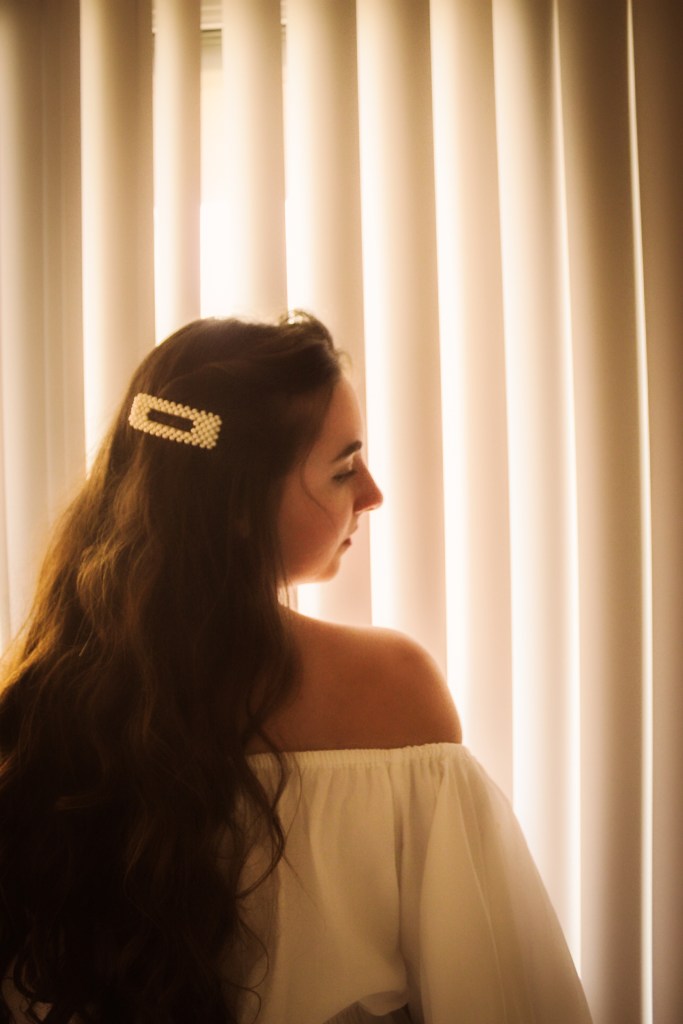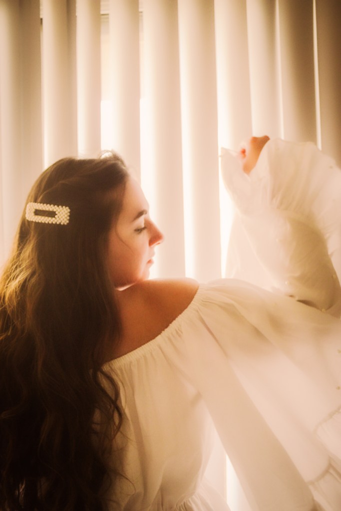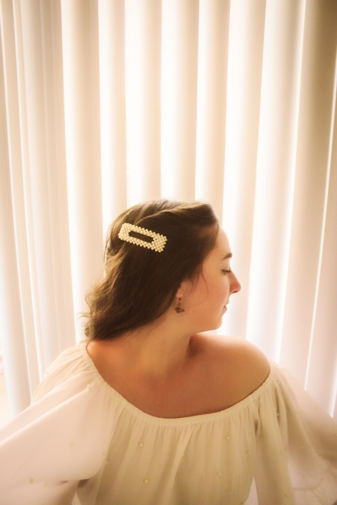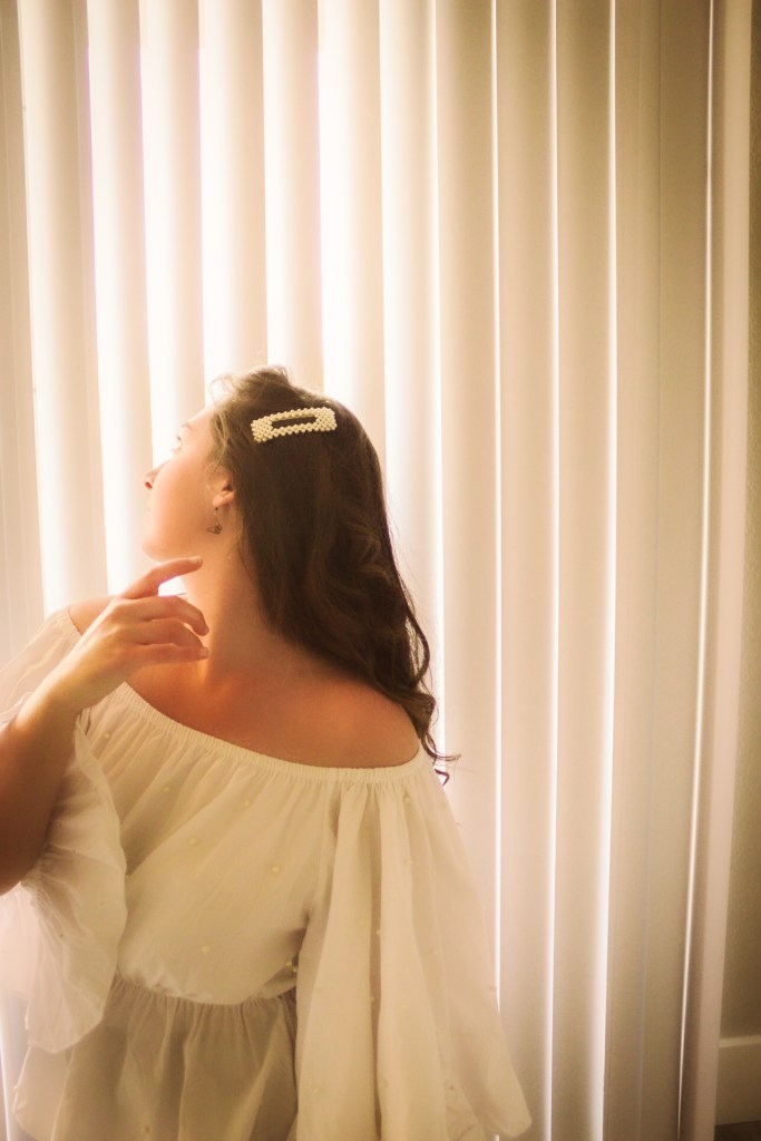 But oh well, I figured I needed to get some bang for my buck so I threw on a pearl barrette to match the pearls on the shirt and some butterfly earrings. I’d been wanting to do photos with my blinds as a background and I love the soft, angelic feeling it gave this shoot.