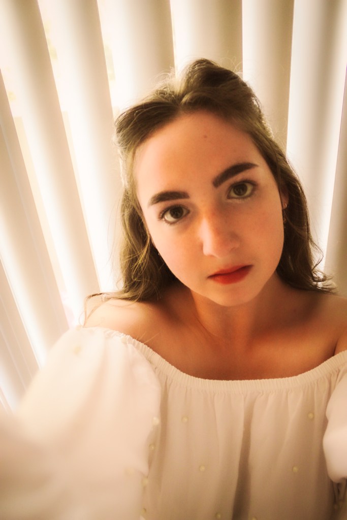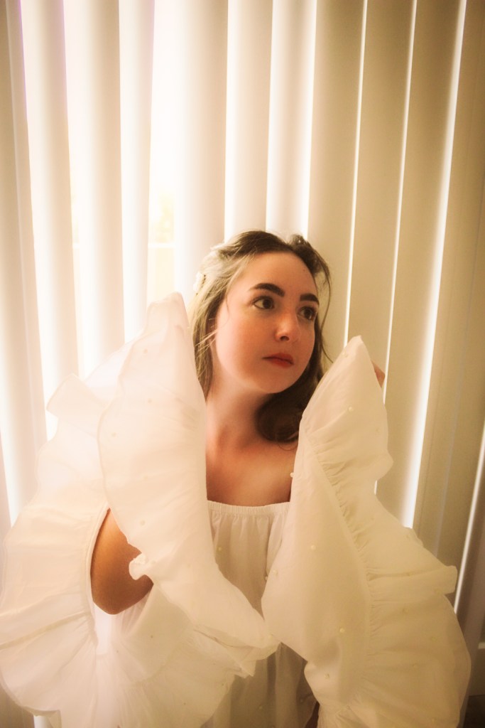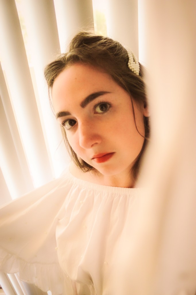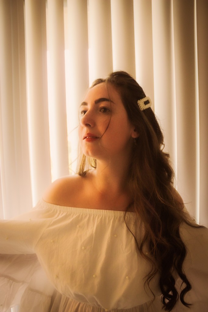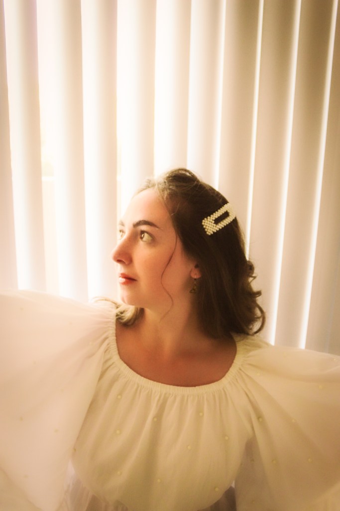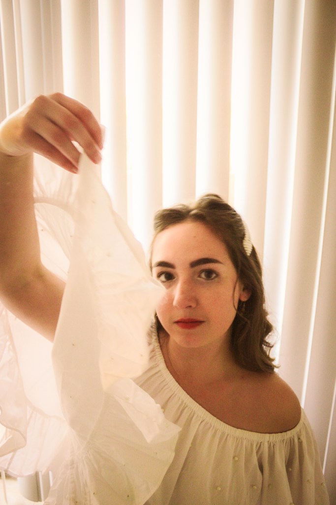 But oh well, I figured I needed to get some bang for my buck so I threw on a pearl barrette to match the pearls on the shirt and some butterfly earrings. I’d been wanting to do photos with my blinds as a background and I love the soft, angelic feeling it gave this shoot.